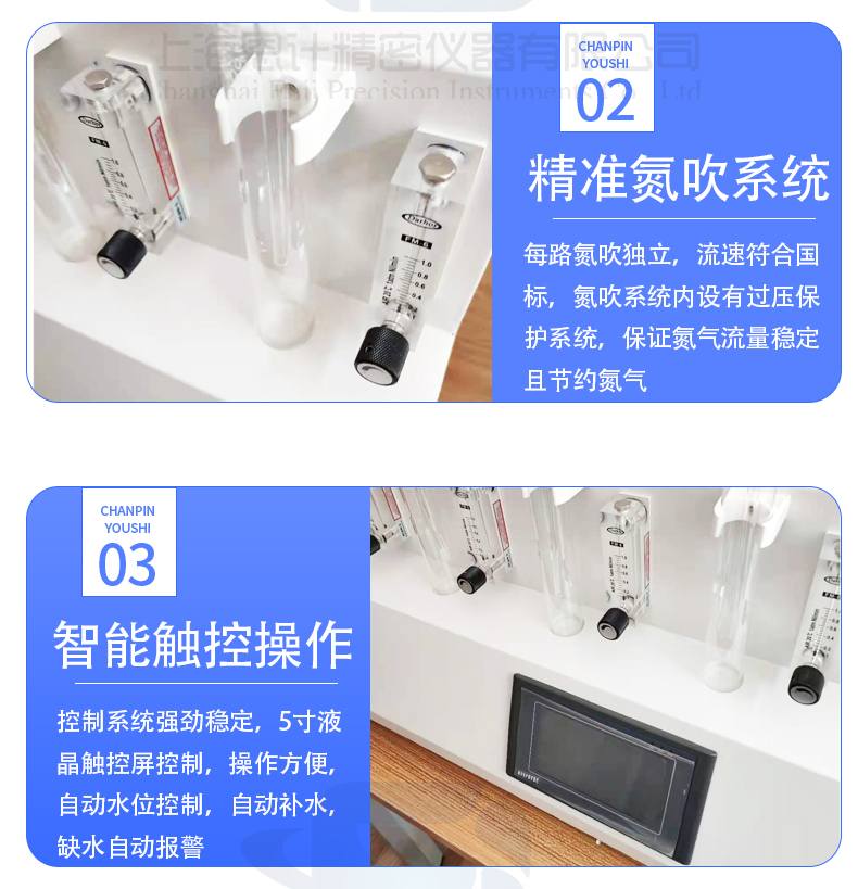 5、主機(jī)設(shè)有可方便外接氮?dú)庠吹膶S媒涌冢到y(tǒng)內(nèi)設(shè)有過壓保護(hù)系統(tǒng);每一路都配置穩(wěn)壓閥,保證氮?dú)饬髁糠€(wěn)定且節(jié)約氮?dú)猓?br/>6、每個樣品的氮?dú)饬髁开?dú)立控制,流速控制范圍應(yīng)在0.1-1L/min,符合國標(biāo)范圍;