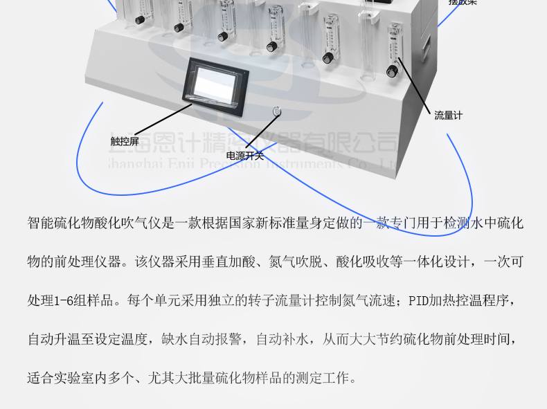 智能硫化物酸化吹氣儀是一款根據(jù)國家新標(biāo)準(zhǔn)量身定做的一款專門用于檢測水中硫化物的前處理儀器。該儀器采用垂直加酸、氮?dú)獯得摗⑺峄盏纫惑w化設(shè)計(jì),一次可處理1-6組樣品。每個單元采用獨(dú)立的轉(zhuǎn)子流量計(jì)控制氮?dú)饬魉伲籔ID加熱控溫程序,自動升溫至設(shè)定溫度,缺水自動報警,自動補(bǔ)水,從而大大節(jié)約硫化物前處理時間,適合實(shí)驗(yàn)室內(nèi)多個、尤其大批量硫化物樣品的測定工作。